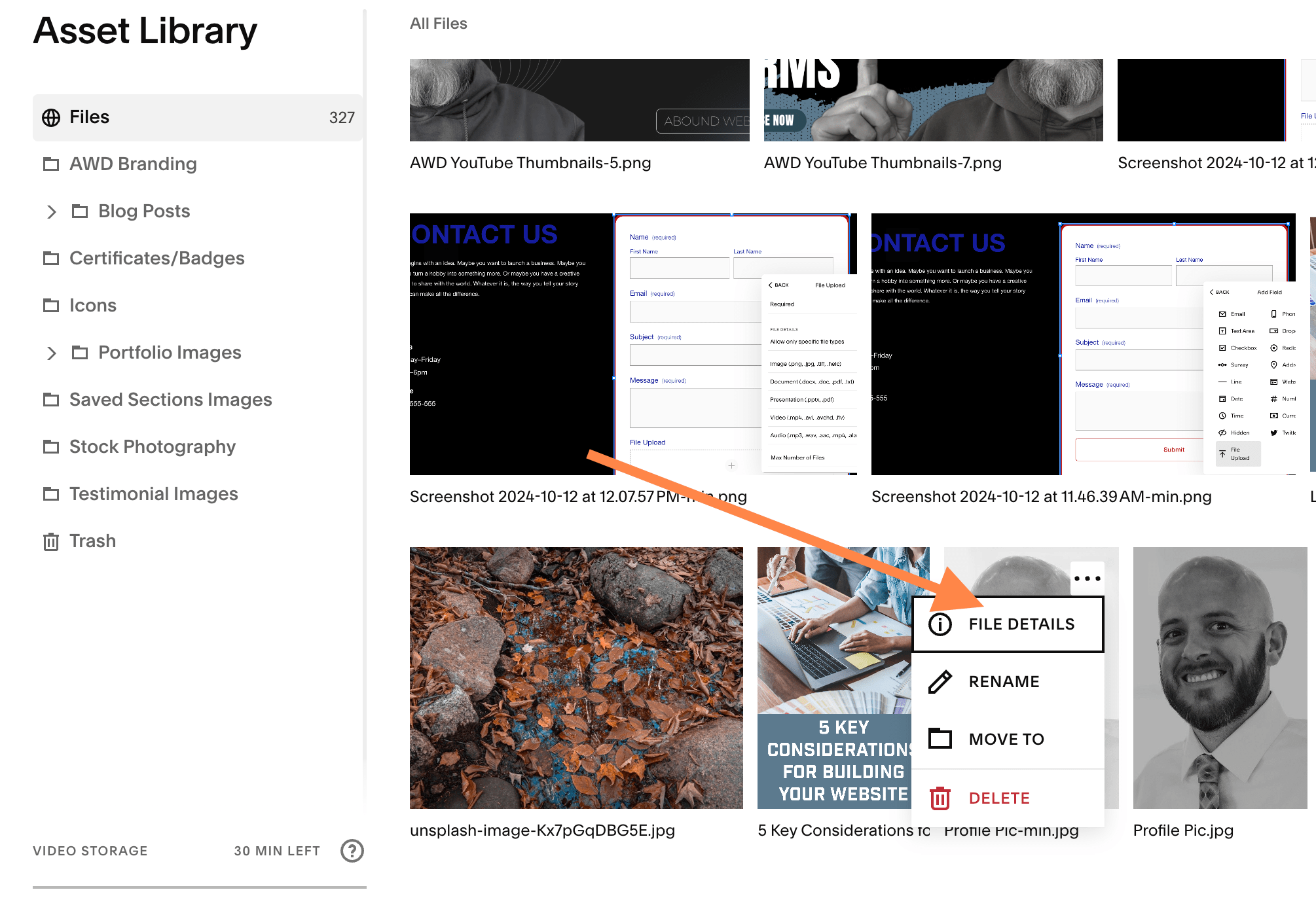 Squarespace’s asset library is straightforward but can get cluttered over time. Here are some quick tips for keeping things organized: